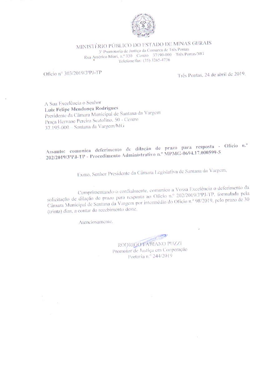 | DMP Nº 008/2019 - Documentos de tribunais e do Ministério Público Interessado: Ministério publico Assunto: Comunica deferimento de dilação prazo para resposta - Oficio n° 202/2019/3ª PJ - Procedimento Administrativo n° MPMG-0694.17.000599-5 Protocolo: 574/2019 Texto Integral |